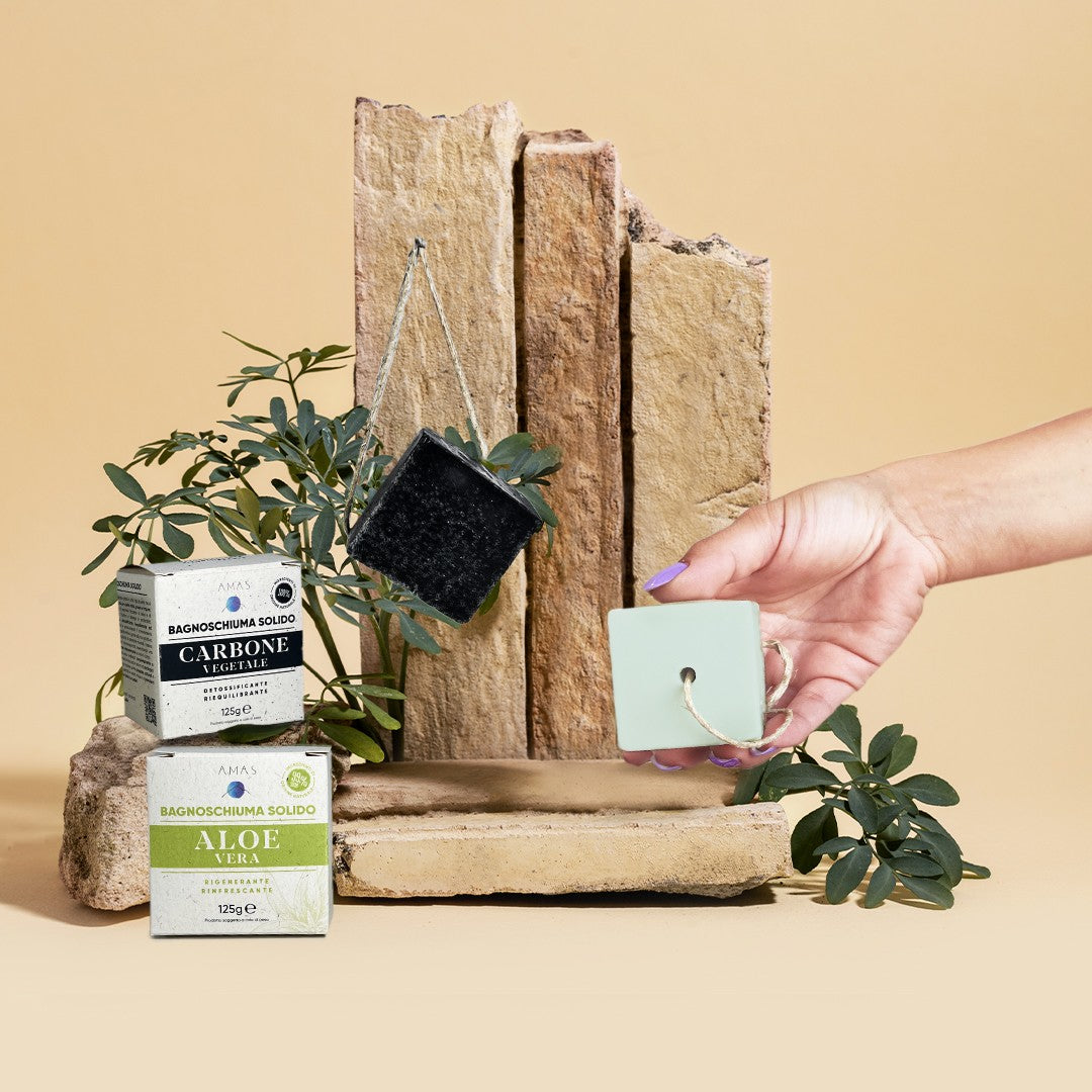 🌱 FORMULA ECOSOSTENIBILE Equivale a 3 Flaconi di normale bagnoschiuma liquido, per un risparmio idrico ed economico. il 100% degli ingredienti è di origine naturale. Packaging in Carta FSC 100% Riciclata, con pratico cordino in canapa. 100% PLASTIC FREE. VEGAN. Fatto a mano in Abruzzo